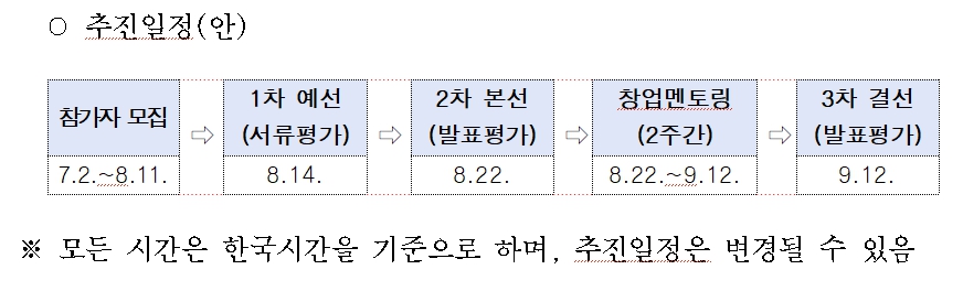 ±¹Á¦ û¼Ò³â â¾÷ ¿Ã¸²ÇǾƵå´Â 1Â÷ ¿¹¼±½É»ç(¼­·ùÆò°¡) ¹× 2Â÷ º»¼±½É»ç(¹ßÇ¥Æò°¡)¿Í ¾à 2ÁÖ°£ÀÇ Ã¢¾÷ ¸àÅ丵À» °ÅÃÄ ÃÖÁ¾ °á¼± ¹«´ë±îÁö À̾îÁø´Ù. ¿¹¼±°ú º»¼±Àº ¼­¿ïâ¾÷Çãºê °ø´ö¿¡¼­ ÁøÇàµÇ¸ç, ±¹¿Ü Âü°¡ÀÚ´Â ¿ÀÇÁ¶óÀÎ ¶Ç´Â ¿Â¶óÀÎ Áß ¼±ÅÃÇÏ¿© ¹ßÇ¥ÇÒ ¼ö ÀÖ´Ù. 3Â÷ ÃÖÁ¾ °á¼±(¹ßÇ¥Æò°¡)¸¦ °ÅÃÄ ÃÑ 10ÆÀÀ» ¼ö»óÀÚ·Î ¼±¹ßÇÒ ¿¹Á¤ÀÌ´Ù.