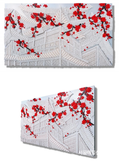 ¡ã Ȳ¶õ, Beyond the Red Wind¡¦, plastic buttons, beads, pins on wooden panel, 120 x 210 cm, 2024  »çÁøÁ¦°ø=°¶·¯¸®¹Ú¿µ