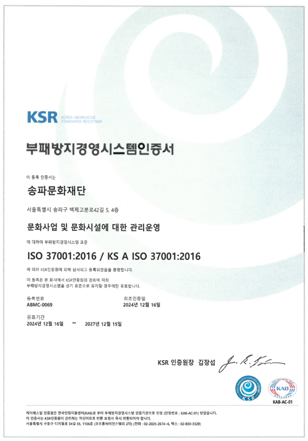 ÇÑÆí, ¼ÛÆÄ¹®È­Àç´ÜÀº Áö¿ª ¹®È­¿¹¼ú ÁøÈïÀ» À§ÇØ ´Ù¾çÇÑ °ø¿¬, Àü½Ã, ¹®È­¿¹¼ú±³À° ¹× Áö¿ø»ç¾÷À» ¿î¿µÇÏ¸ç ±¸¹Î°ú ÇÔ²² ¼ºÀåÇÏ´Â ¹®È­Àç´ÜÀ¸·Î ³ª¾Æ°¡°í ÀÖ´Ù. À̹ø ISO 37001 ÀÎÁõÀº 2024³â 12¿ù 16ÀϺηΠÀ¯È¿Çϸç, 2027³â 12¿ù 15ÀϱîÁö À¯ÁöµÈ´Ù.