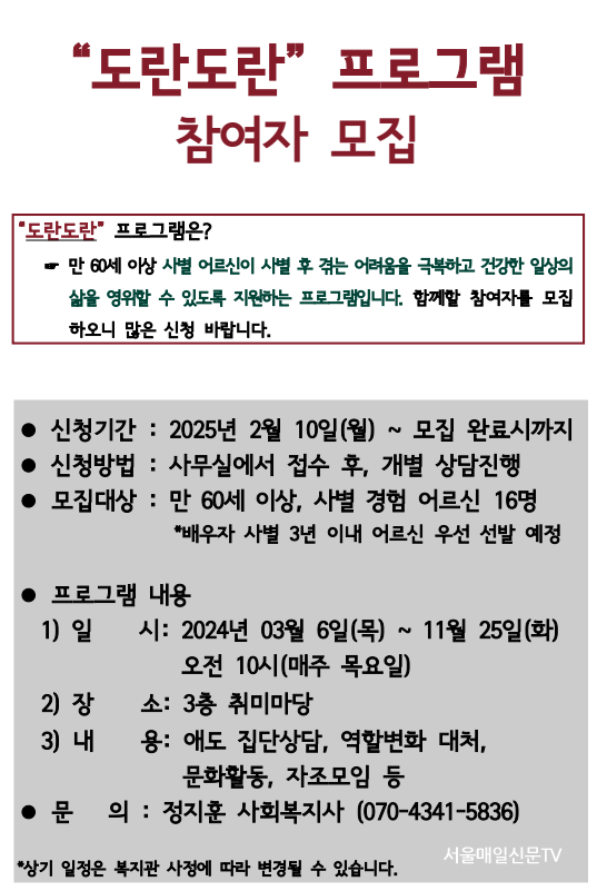 ±è¼­Áß ±âÀÚ / ½Ã¸³Áß¶û³ëÀÎÁ¾ÇÕº¹Áö°ü(°üÀå Ãֱͼ±)Àº »çº° ¾î¸£½ÅÀ» À§ÇÑ Àü¹® Ưȭ ÇÁ·Î±×·¥, ¡®µµ¶õµµ¶õ¡¯ Âü¿©ÀÚ¸¦ ¸ðÁýÇÑ´Ù.¡®µµ¶õµµ¶õ¡¯ ÇÁ·Î±×·¥Àº »çº° °æÇèÀÌ ÀÖ´Â ¾î¸£½ÅµéÀÌ ÇÔ²² ¸ð¿© ¼­·Î¸¦ À§·ÎÇÏ°í ½½ÇÄÀ» ÇÔ²² ³ª´©¸ç, »çº° ÈÄ ¾î·Á¿ò¿¡ Àß ´ëóÇÒ ¼ö ÀÖ´Â ´Ù¾çÇÑ ÇÁ·Î±×·¥À» ÅëÇØ ÀÏ»óÀÇ »îÀ» ȸº¹ÇÒ ¼ö ÀÖµµ·Ï ¸¶·ÃµÆ´Ù.