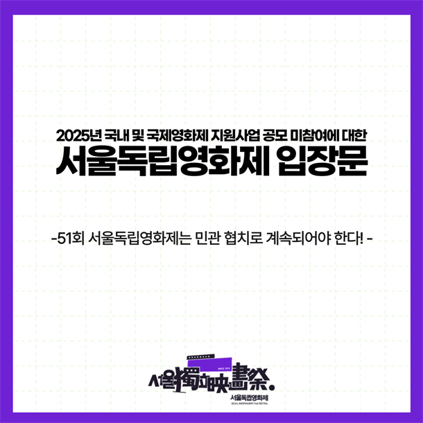 ±è¼­Áß ±âÀÚ / ¼­¿ïµ¶¸³¿µÈ­Á¦°¡ 2025³â ±¹³»¿Ü ¿µÈ­Á¦ Áö¿ø»ç¾÷ °ø¸ð¿¡ Âü¿©ÇÏÁö ¾Ê°Ú´Ù°í ¹àÇû´Ù. ÀÌ´Â À±¼®¿­ Á¤ºÎÀÇ ¿µÈ­ ¿¹»ê »è°¨ ¹× ºÒÇÕ¸®ÇÑ Á¤Ã¥¿¡ ´ëÇÑ °­·ÂÇÑ ¹Ý¹ß·Î Ç®À̵ȴÙ. ¼­¿ïµ¶¸³¿µÈ­Á¦´Â Áö³­ 50³â°£ Çѱ¹ µ¶¸³¿µÈ­ÀÇ »ê½Ç ¿ªÇÒÀ» ÇØ¿ÔÁö¸¸, Á¤ºÎÀÇ ¿¹»ê Àü¾× »è°¨ °áÁ¤¿¡ ¸Â¼­ °ø¸ð Âü¿©¸¦ °ÅºÎÇϸç Á¤Ã¥ °³¼±À» Ã˱¸ÇÏ´Â °­°æÇÑ ÀÔÀåÀ» Ç¥¸íÇß´Ù.